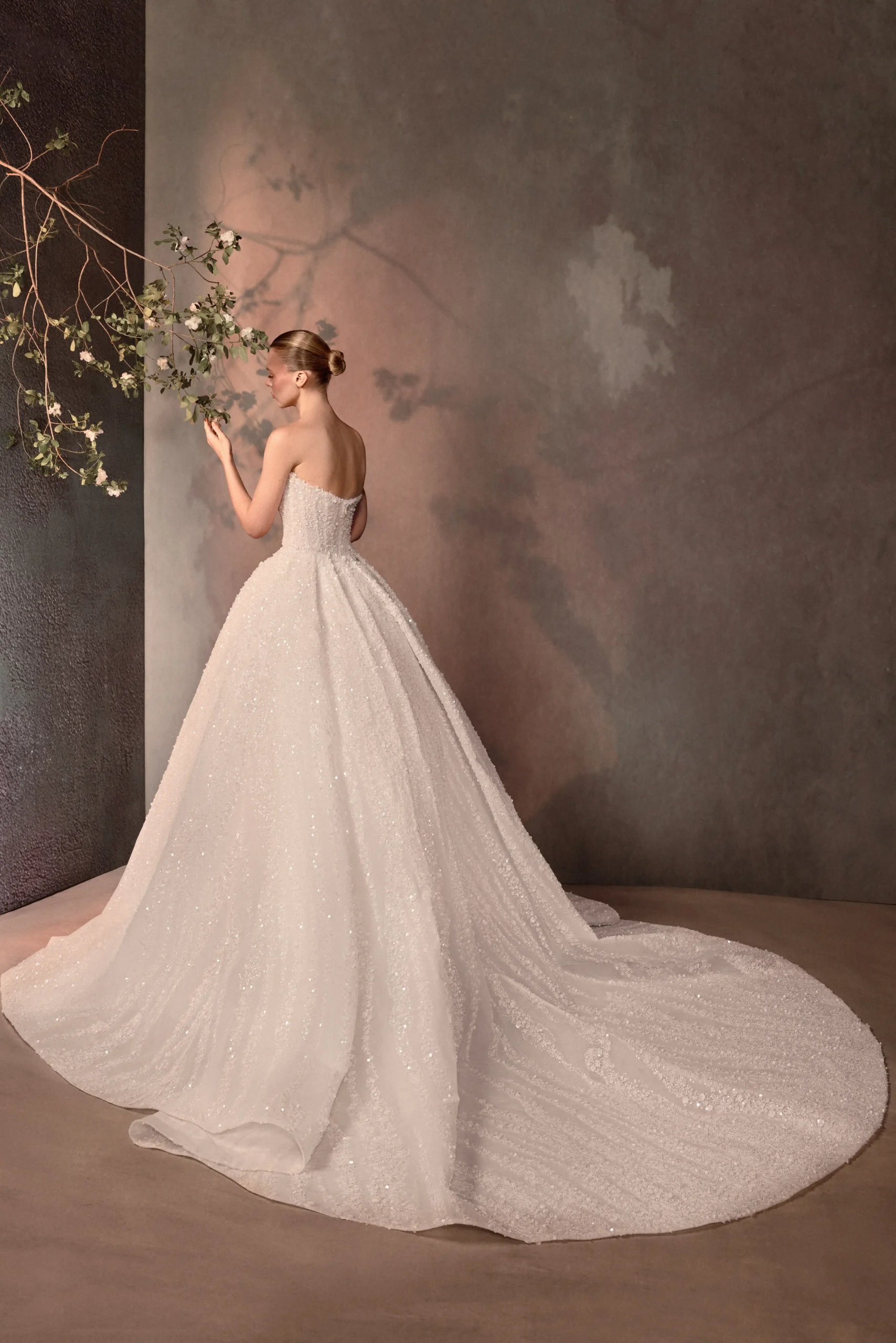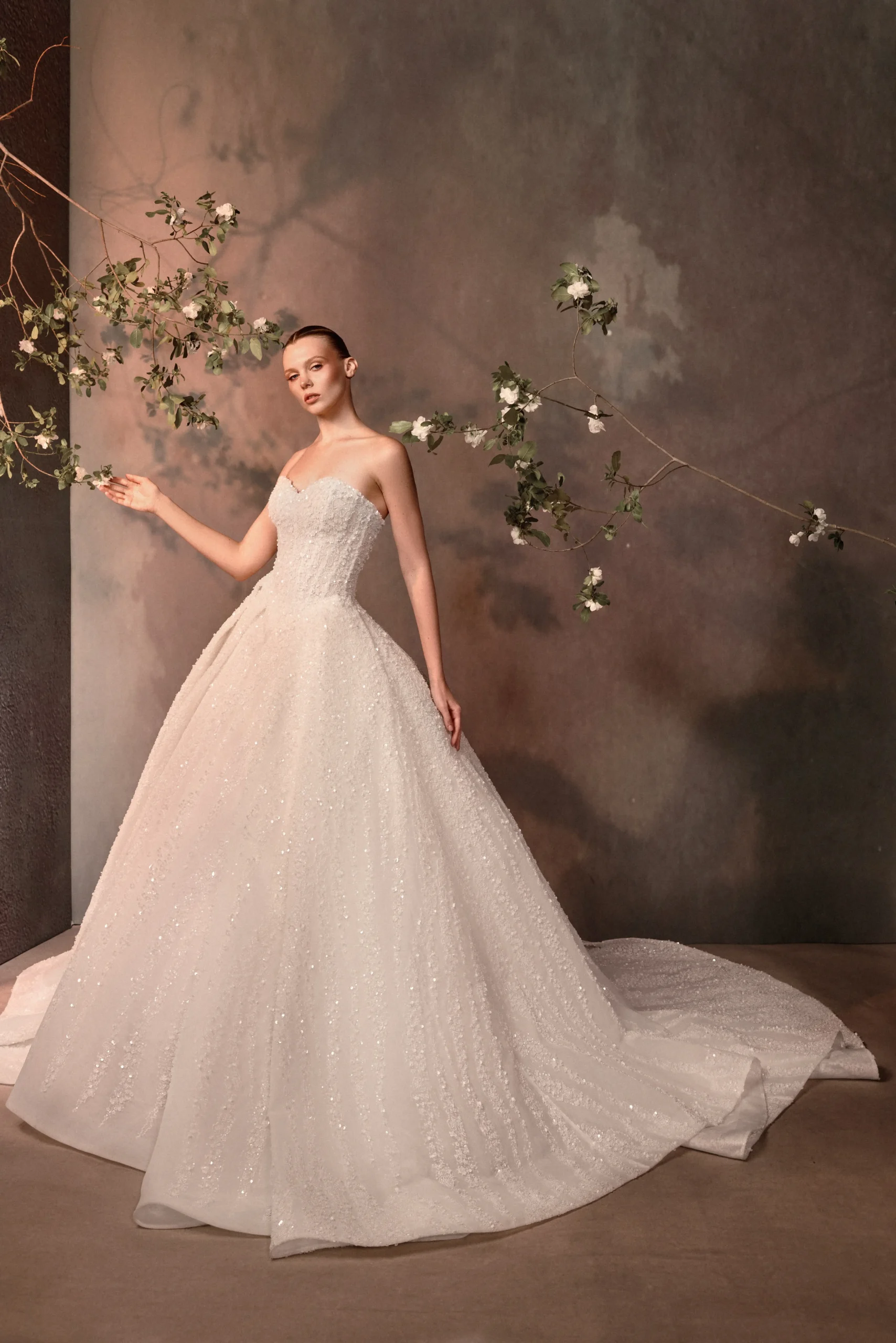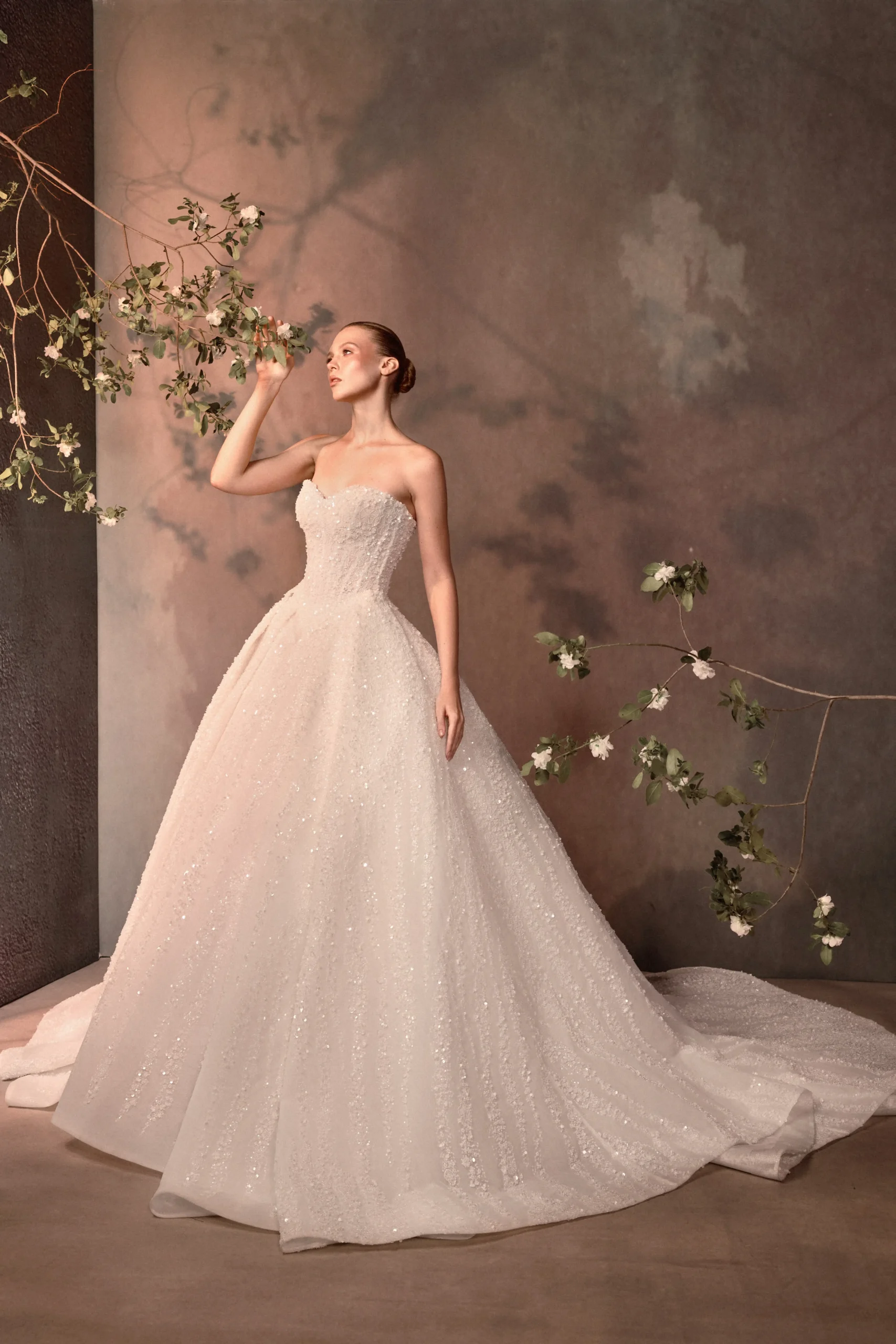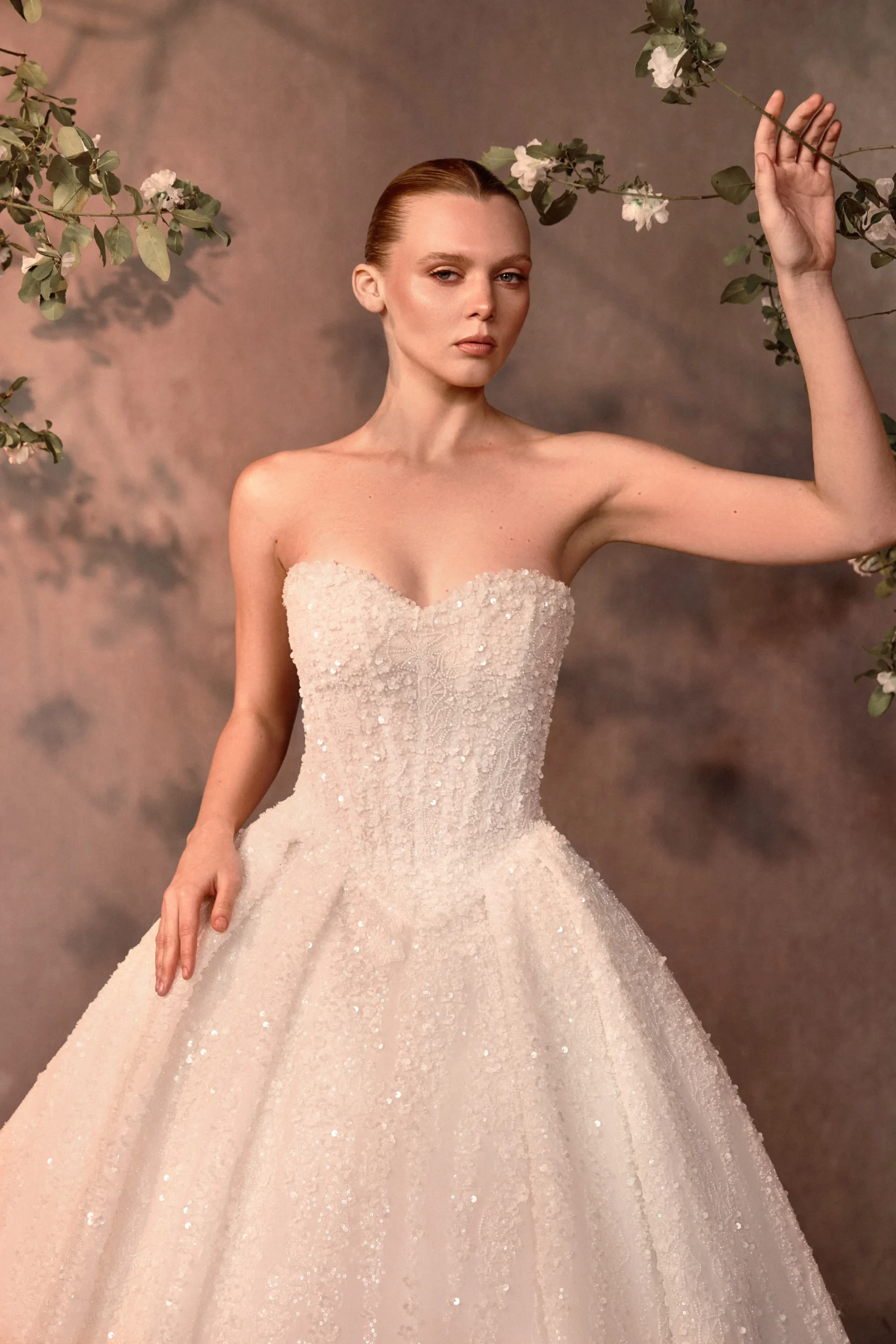 This gown features a sculpted sweetheart corset with a deep V-cut waist, meticulously contouring the bodice to create a sleek, elongated frame. Transitioning into a dramatic, high-volume ballgown, the low waist architecture provides a structural base for an expansive, cloud-like skirt. Reflecting the delicate spirit of the collection, the entire silhouette is hand adorned with intricate 3D white flowers , creating a radiant, multi-dimensional texture that catches the light with every movement.