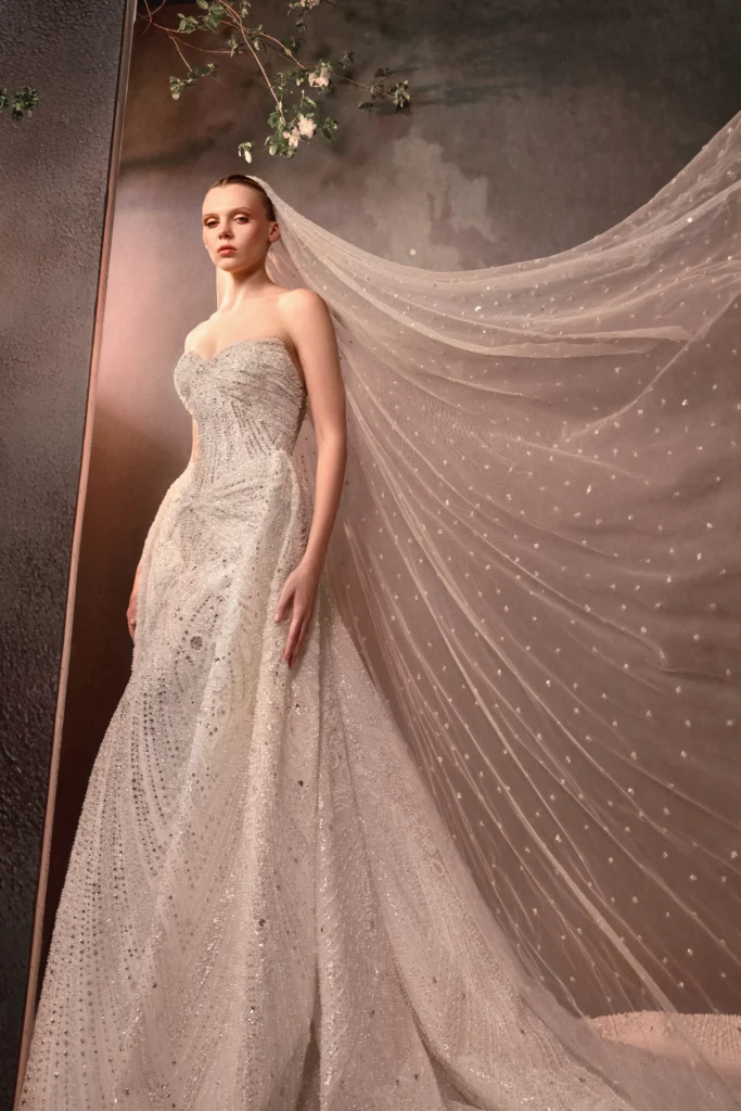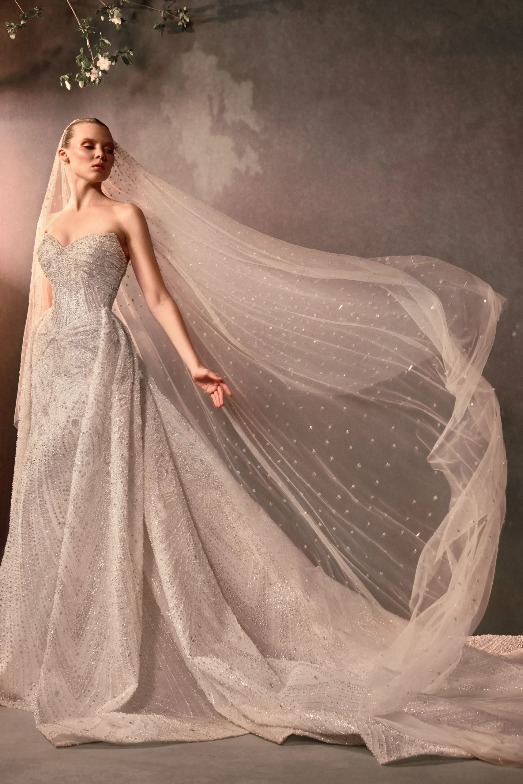 This gown is a masterpiece of modern royalty, defined by its rare and luminous platinum and silver color palette. The architecture features a sculpted V cut, low waisted corset that transitions into a sleek mermaid silhouette, paired with a majestic, voluminous overskirt.The entire piece is a labor of hand-crafted artistry, encrusted with silver Swarovski crystals that create a heavy, metallic shimmer against the platinum base. This unique tonal depth offers a different, unforgettable look for the bride who seeks a bold, celestial glow. Designed to be both timeless and avant-garde, the gown balances high-fashion structural precision with an opulent, regal presence.