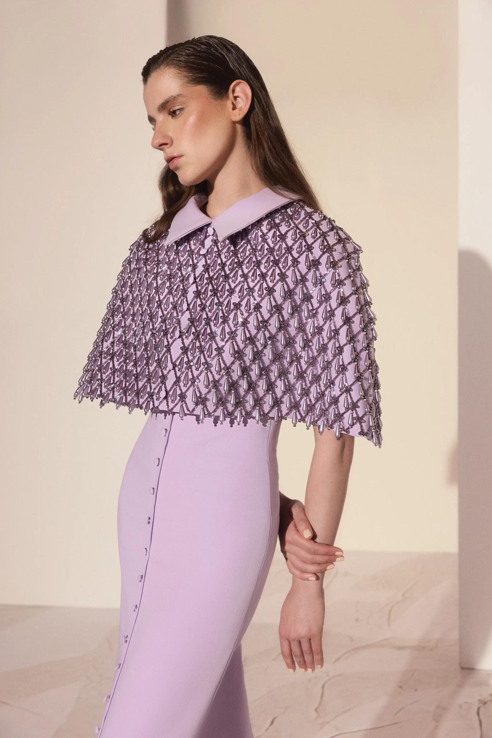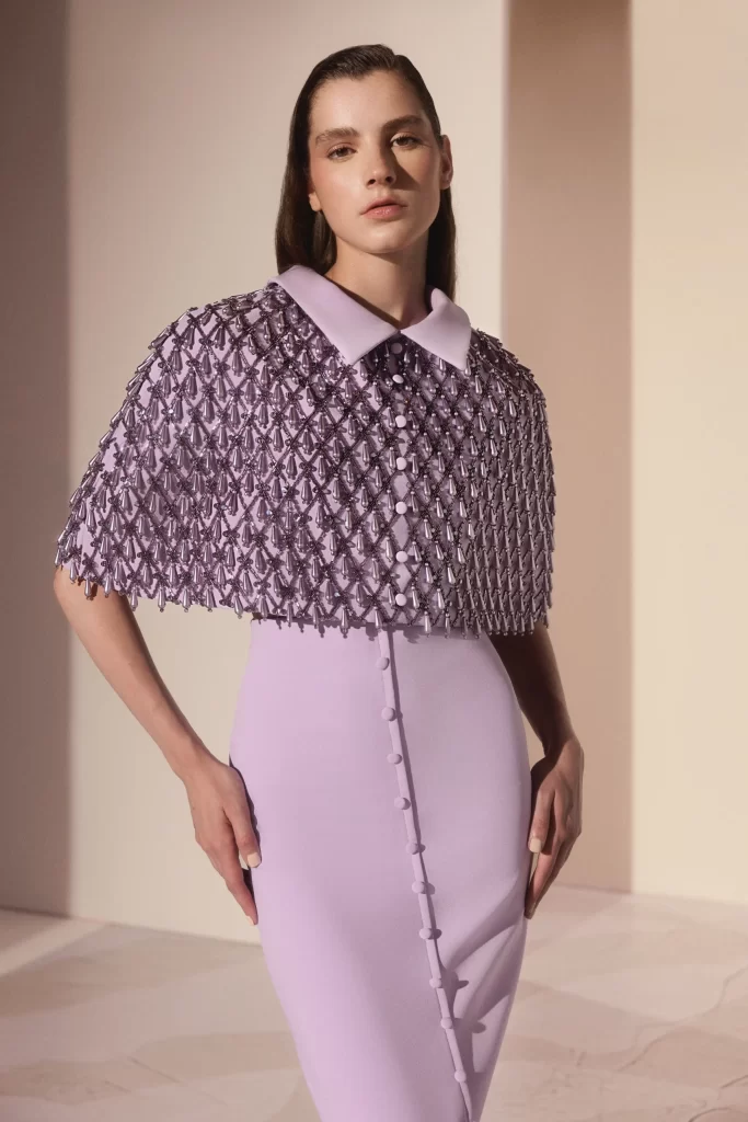 A modern two-piece set in purple, fully hand-embroidered with pearls and crystals, paired with a straight-cut crepe skirt for a sleek and elegant silhouette.
