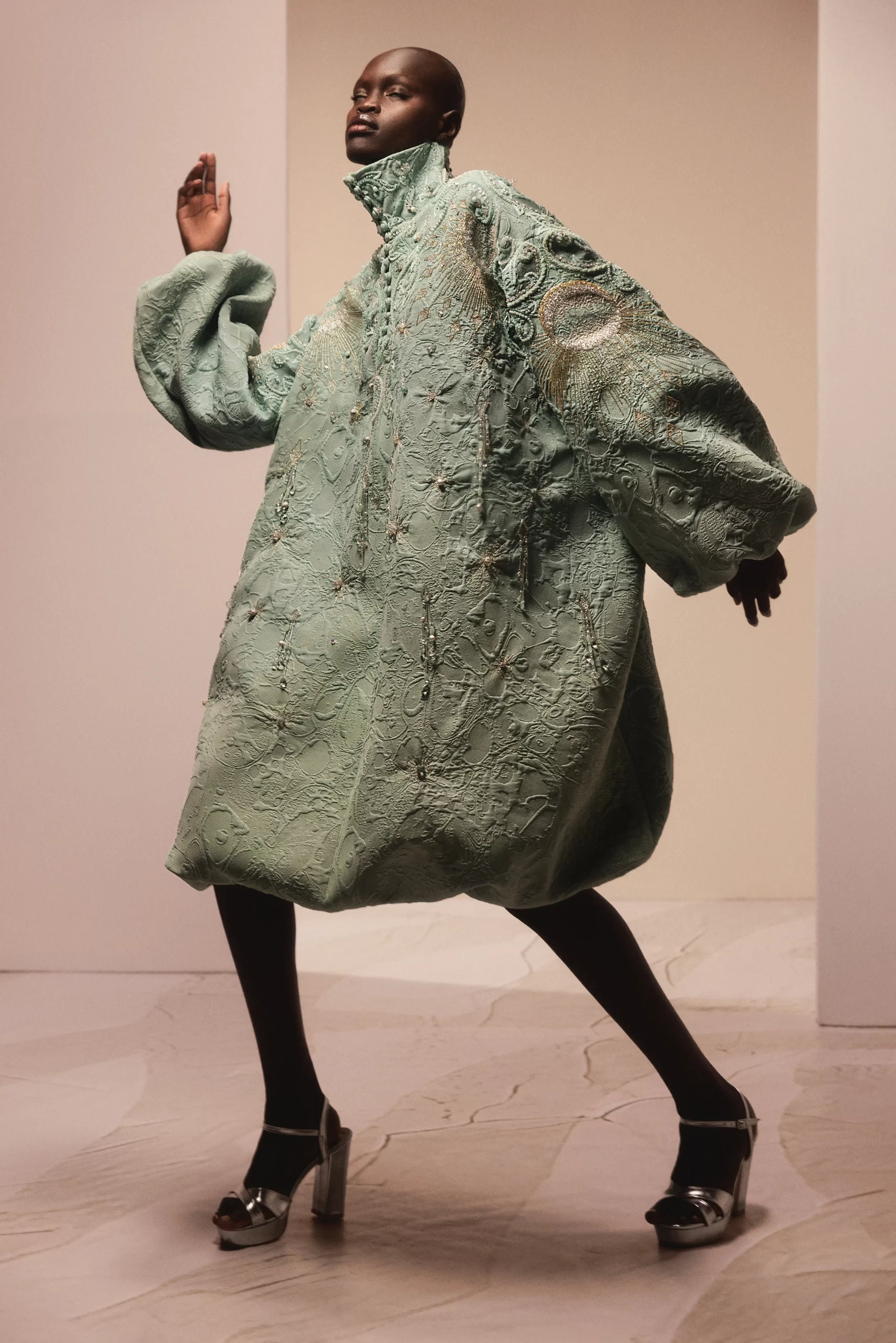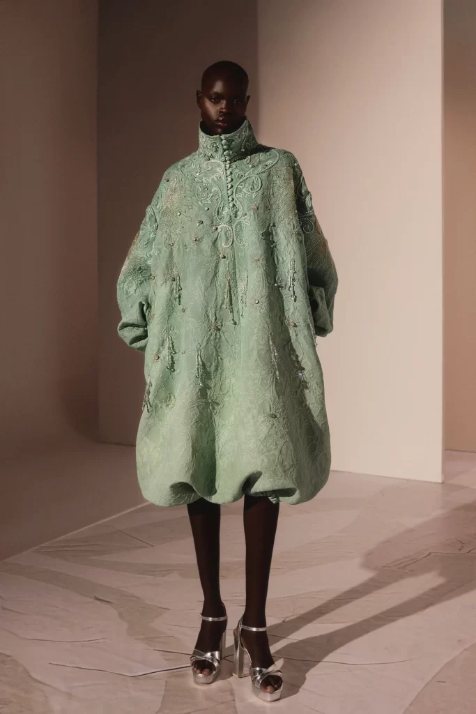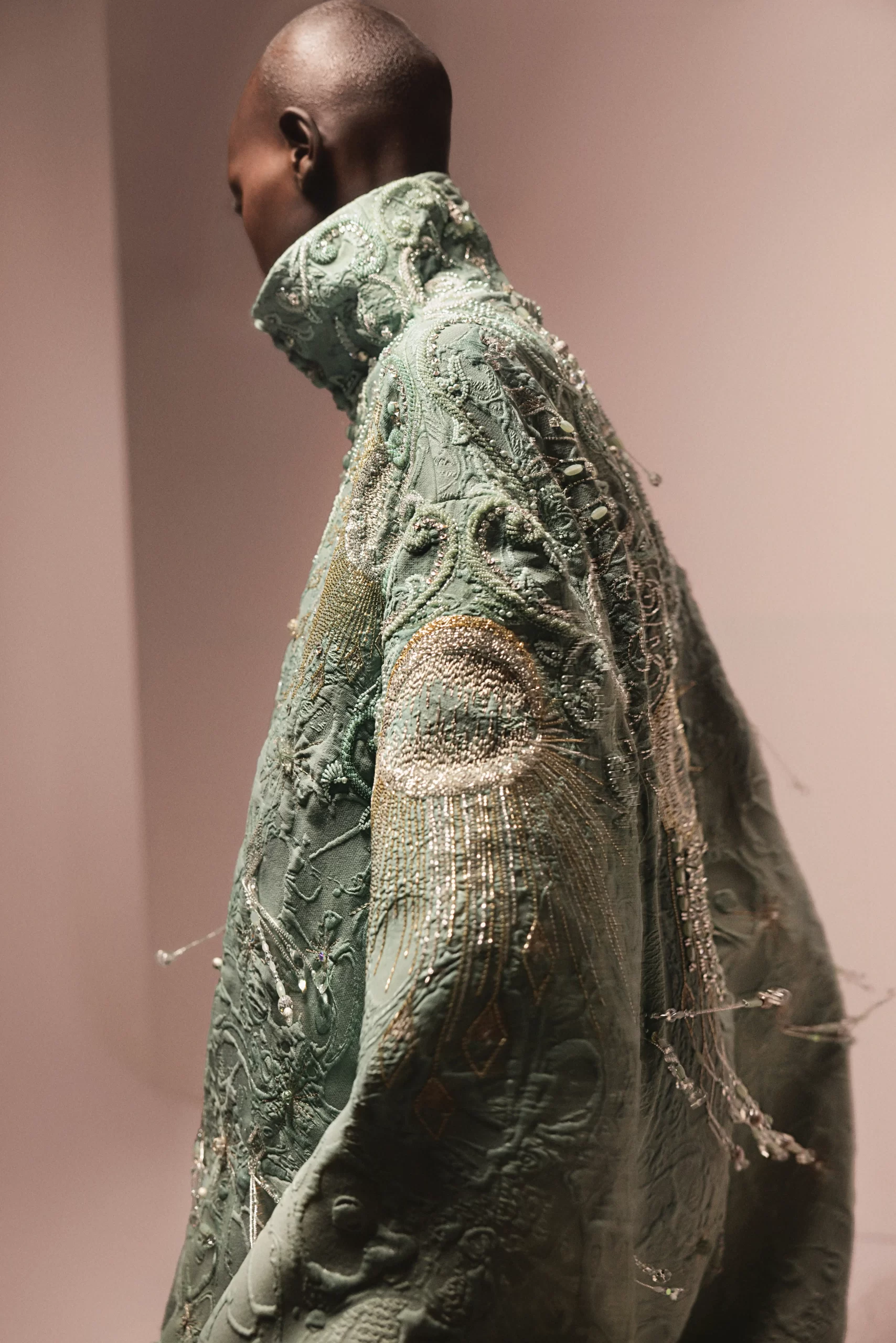 A couture bomber jacket in a refined mint-green degradation, blending elegance with innovation. Adorned with modern oriental-inspired embroidery and crafted using a new Charleston technique, this piece tells the poetic story of the moon and the sun over a barren desert, where no green exists in nature, transforming absence into a vision of hope and beauty.