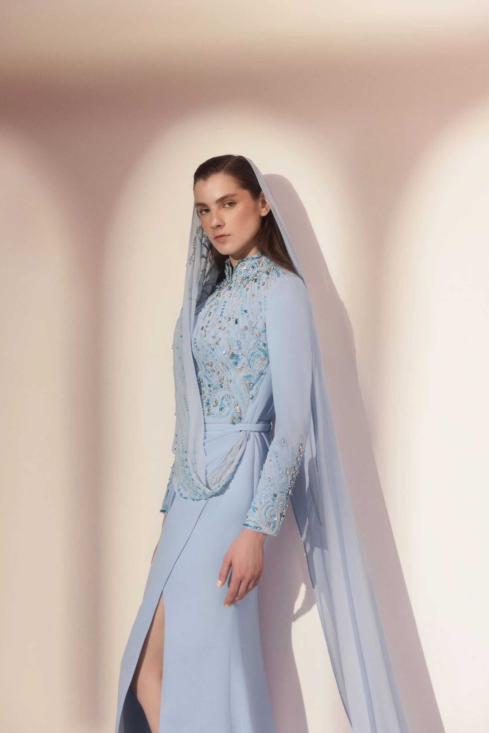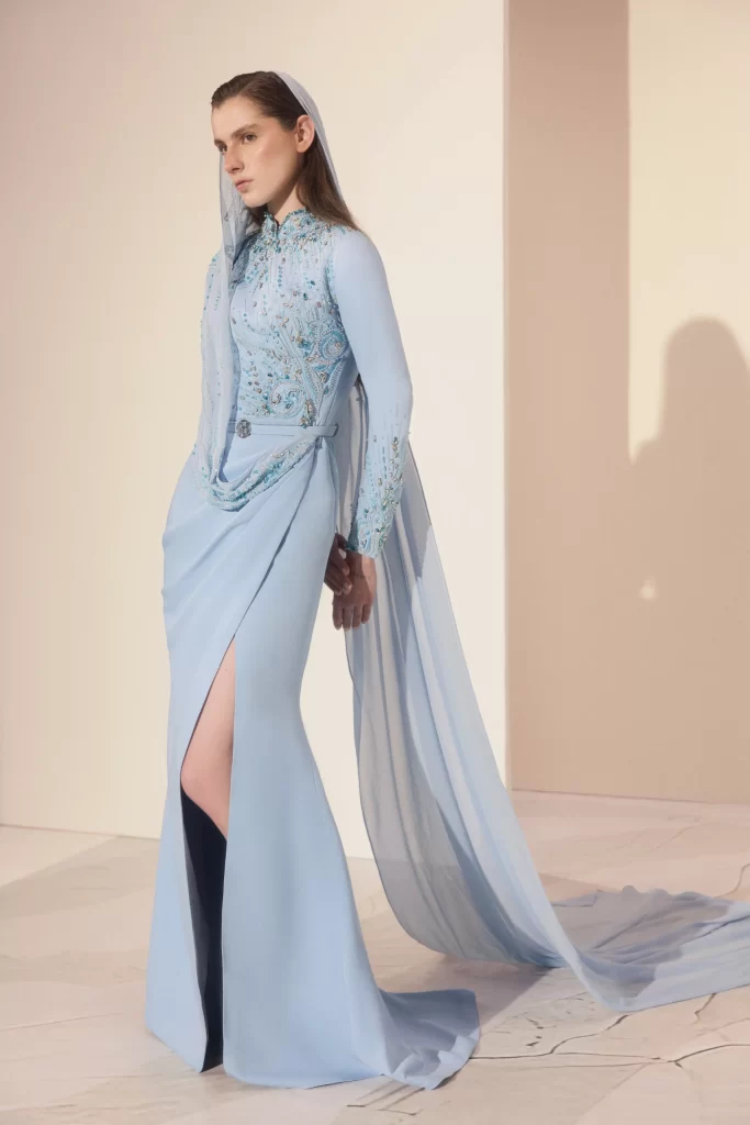 A blue crepe mermaid dress with long sleeves, featuring a fully hand-embroidered corset adorned with Swarovski crystals and intricate oriental motifs. A flowing embroidered veil extends from the waist to the floor, adding elegance and movement, while a signature belt accentuates the waist for a refined, couture finish.