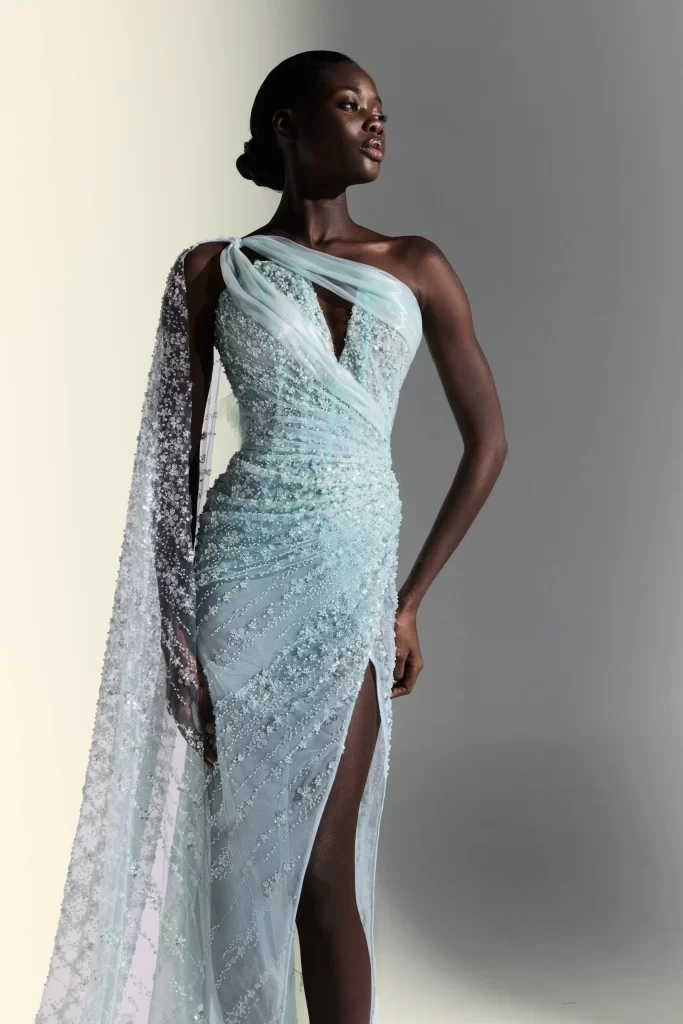 Aqua blue one-shoulder mermaid dress featuring an organza detail on the bust, a side slit, and a flowing removable cape for an elegant and dramatic look.