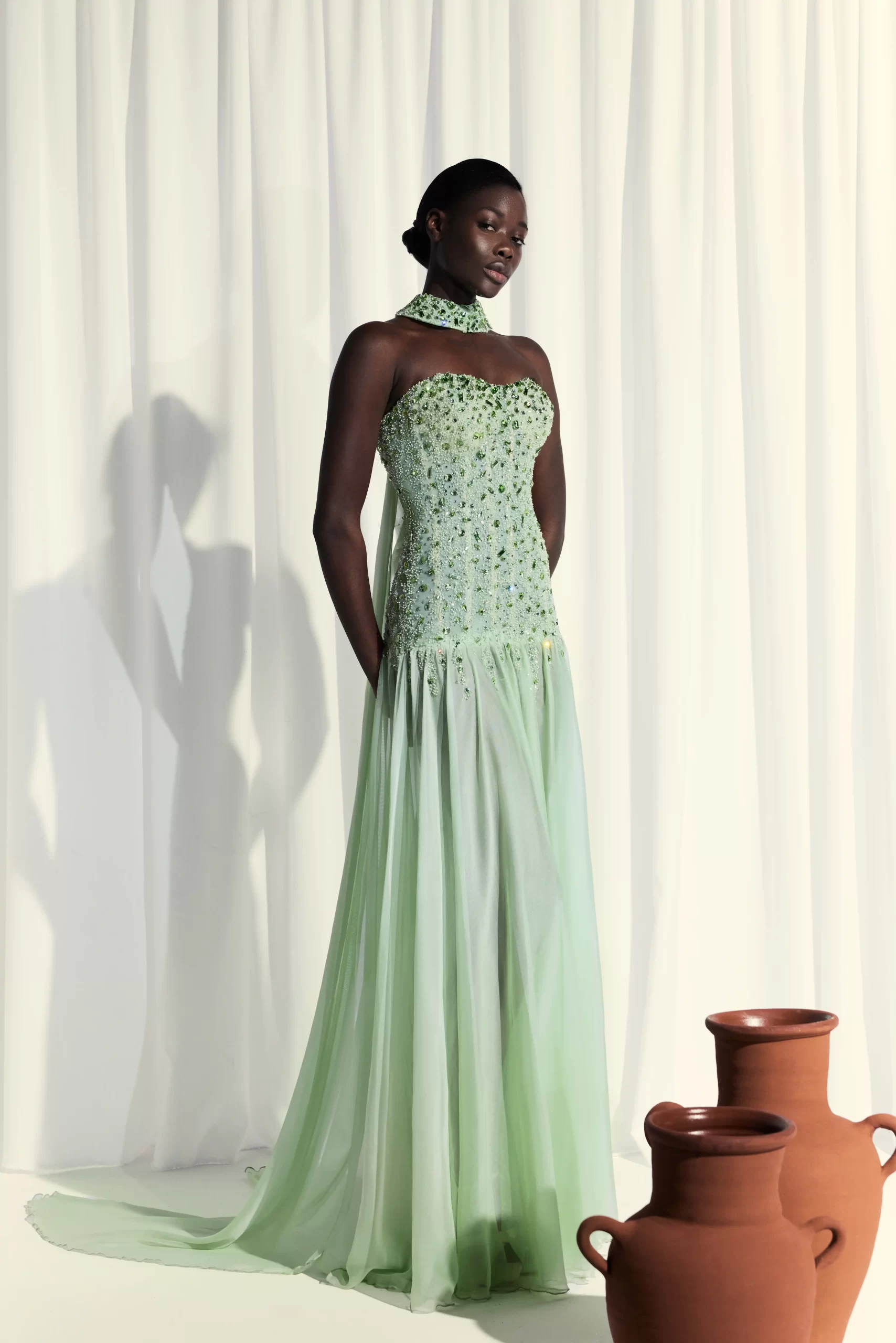Mint green sweetheart dress with a low-waist corset and flowy skirt, fully embellished with stones. Comes with a choker-style muslin cape for an elegant and refined look.