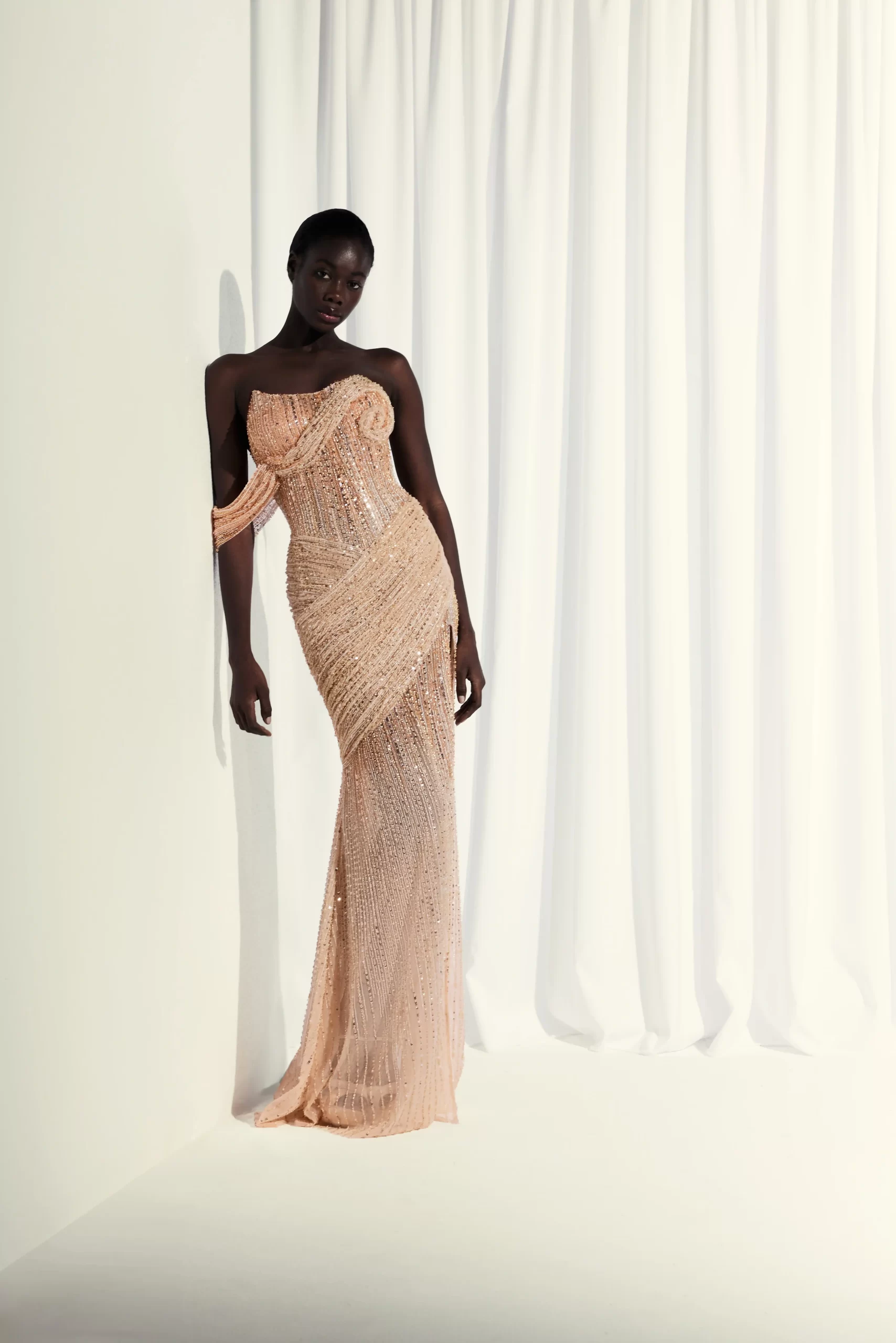 Peach dress in shades of gold featuring a moon-cut, low V-cut corset with draped details on the waist and flowing movement from the bust to the off-shoulders for an elegant, refined look.